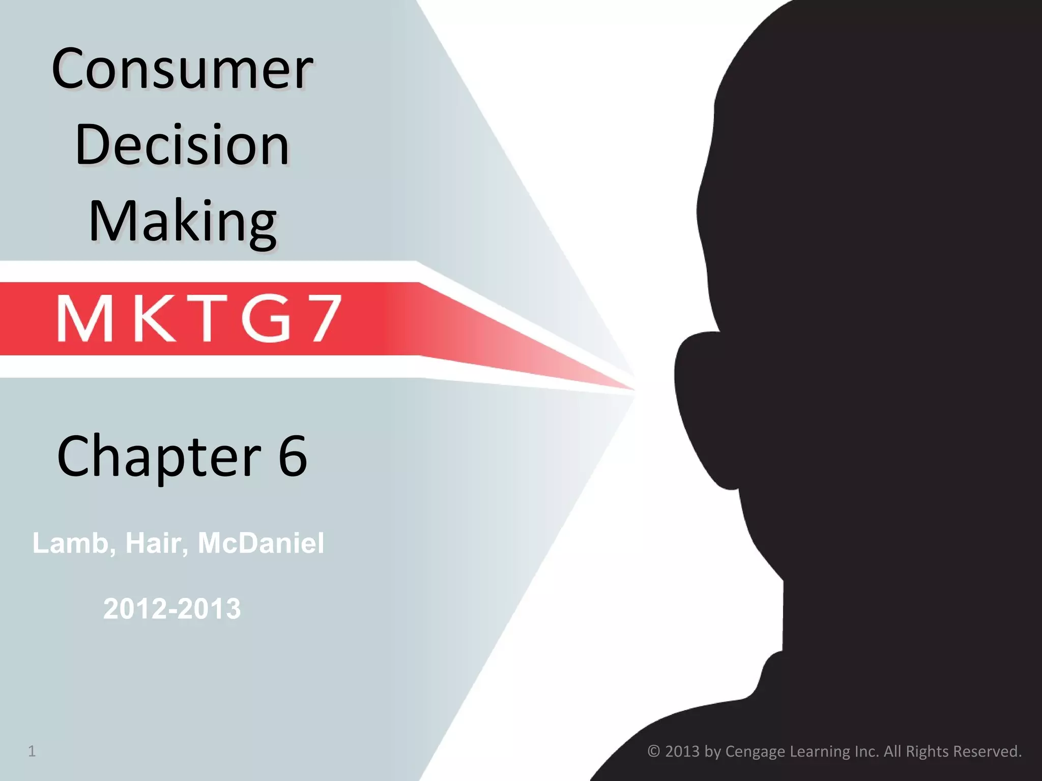 This document outlines key concepts related to consumer behavior and the consumer decision-making process. It discusses the importance of understanding consumer behavior for marketing managers. The major sections are: 1) the components of the consumer decision-making process, including need recognition, information search, evaluation of alternatives, purchase, and post-purchase evaluation; 2) the types of consumer buying decisions and the significance of consumer involvement; 3) the cultural, social, individual, and psychological factors that influence consumer decisions.