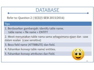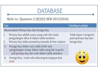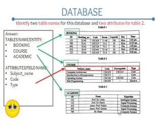 The document provides an introduction to databases. It defines key database concepts including database, database management system (DBMS), table, record, and field. It explains that a database contains organized data stored in tables which contain records made up of related fields. An example is provided of a school database containing data about students, instructors, classes, and student schedules. Advantages of databases include data sharing, improved security and integrity, and reduced redundancy. Disadvantages include complex design, costs, and training needs. Primary keys uniquely identify each record in a table while foreign keys in one table match the primary key of another table to link the tables.