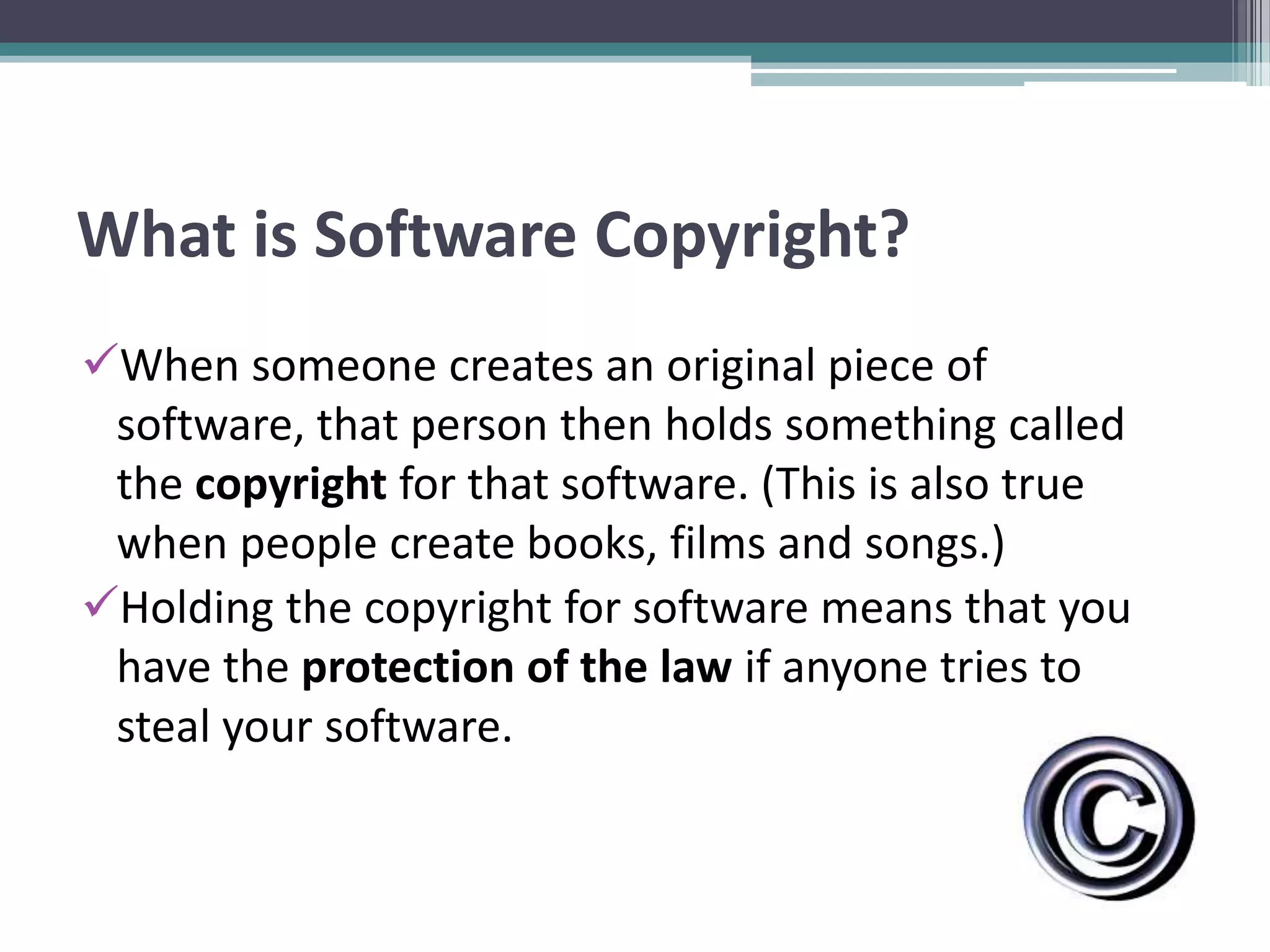 The document discusses software copyright, describing how copyright law protects the creators of original software by prohibiting copying, sharing, or distributing the software without permission. It notes that creating software can involve significant time and effort, so copyright protects this work. The document also provides examples of how to identify genuine licensed software versus pirated copies.