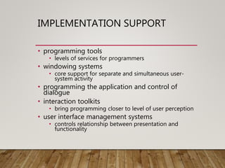 1. It describes different layers of development tools like windowing systems, interaction toolkits, and user interface management systems that bring programming closer to the user's perspective.