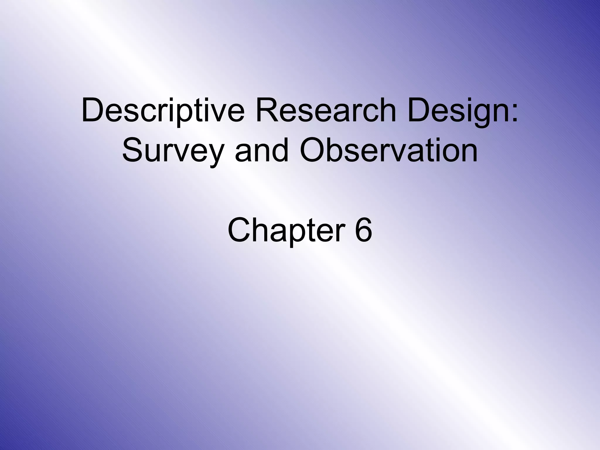 The document provides an overview of survey and observational research methods. It discusses different types of survey methods including telephone, personal, mail, and electronic surveys. It also covers structured vs unstructured observation, natural vs contrived observation, and personal, mechanical, audit, and content analysis observational methods. Key factors for evaluating survey and observational techniques are described such as flexibility, sample control, response rates, and costs.