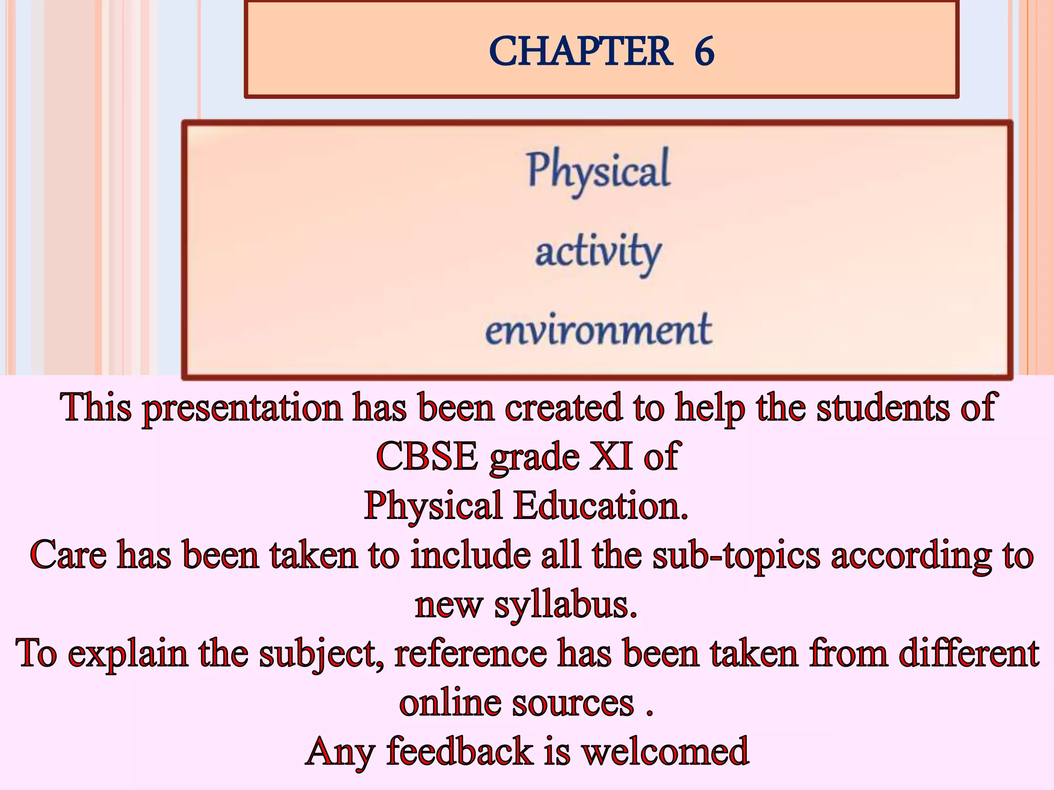 This document discusses physical activity and the environment needed to support it. It defines physical activity and exercise, and describes different types including lifestyle, lifetime, and vigorous activity. It outlines the benefits of physical activity for physical and mental health. Key elements of a positive sports environment include proper facilities, encouragement, sports programs in schools, community influence, spectators, and regular tournaments. Principles for a good physical activity environment include location, facilities, climatic conditions, and following the PROVRBS principles of progression, regularity, overload, variety, recovery, balance, and specificity. Environmental factors like wind, rain, crowd noise, and warm weather can also impact physical activity and need to be considered.