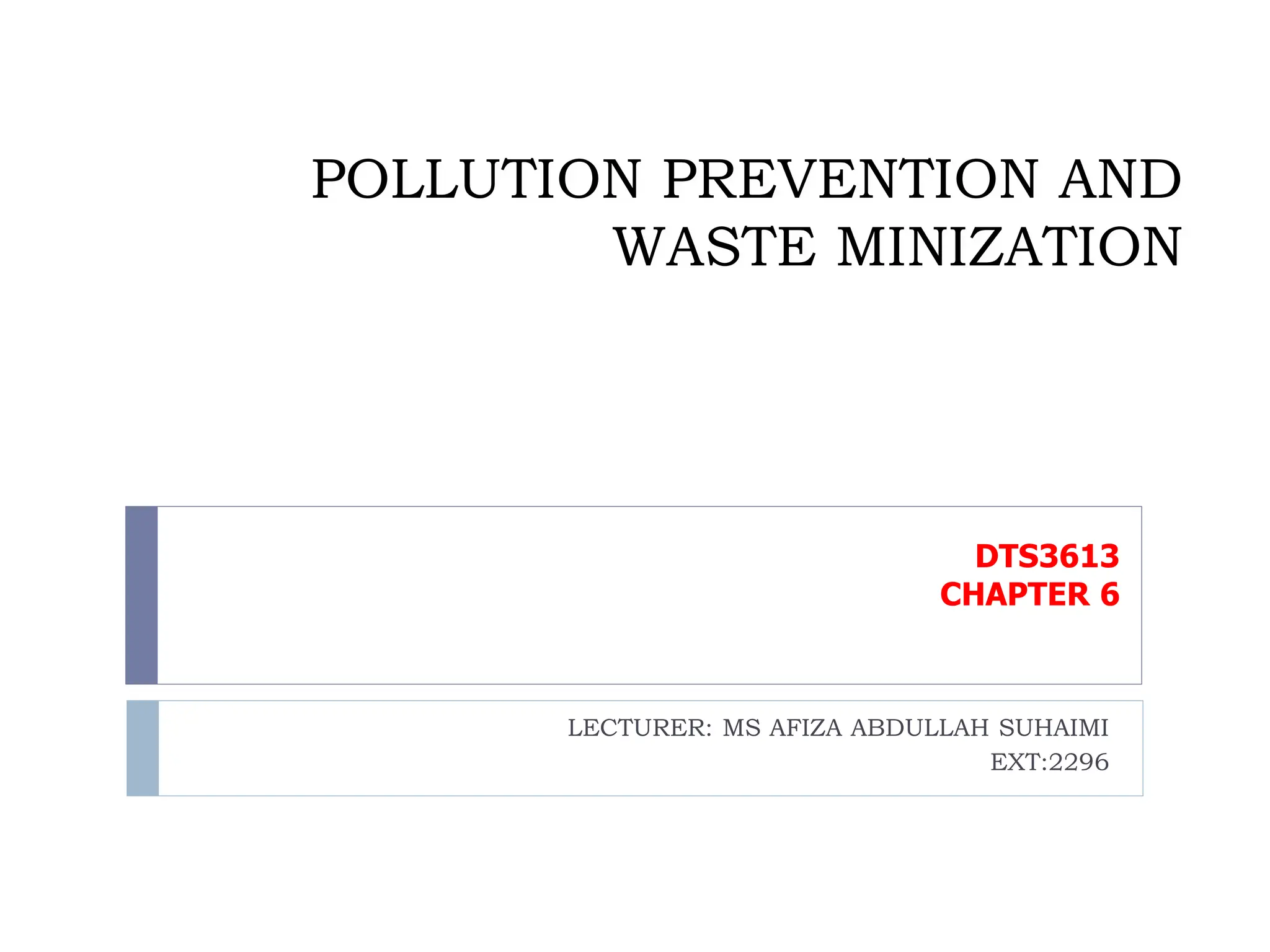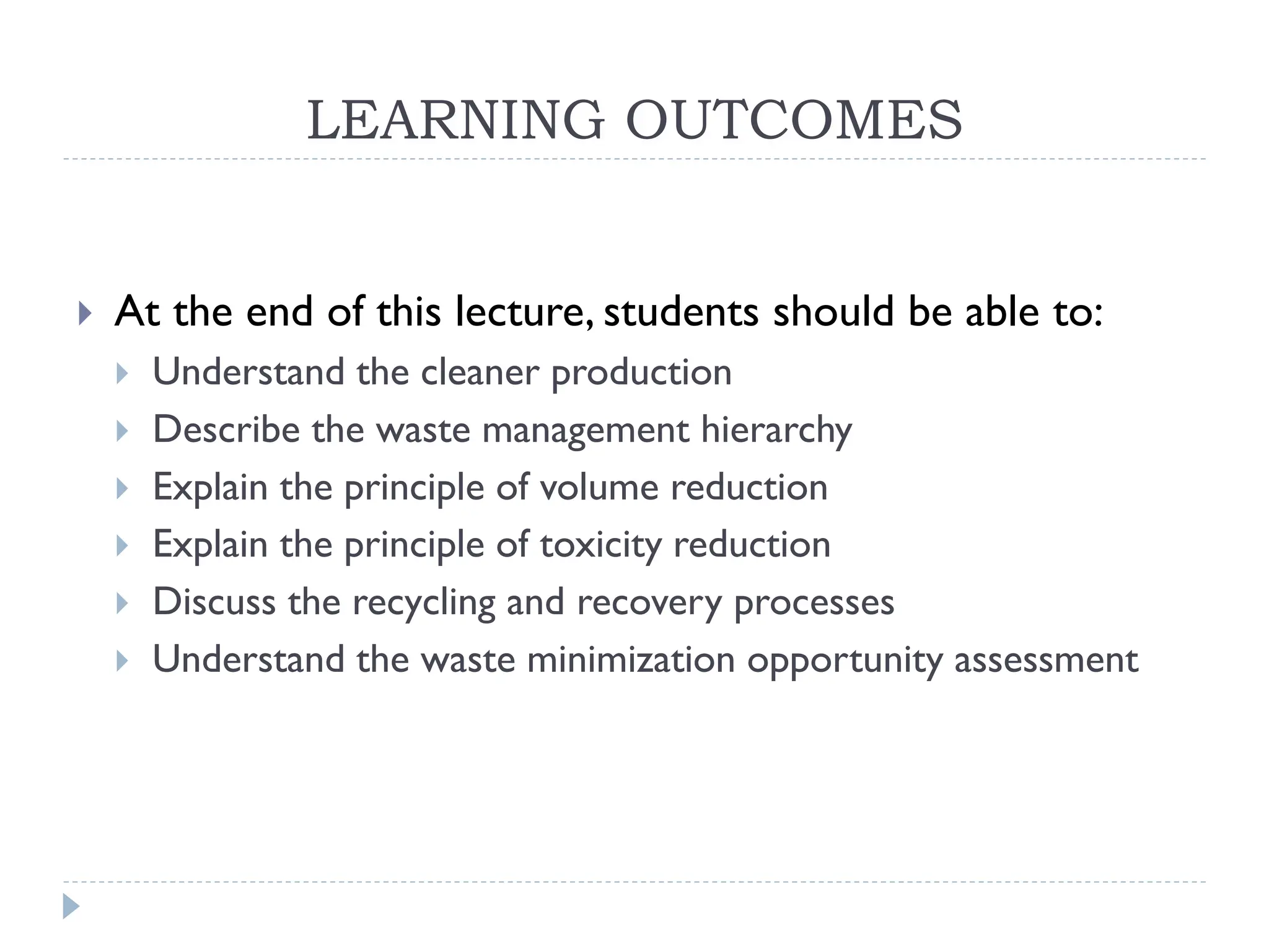 The document focuses on pollution prevention and waste minimization, outlining learning outcomes for students including concepts like cleaner production, waste management hierarchies, and recycling processes. Key strategies for source reduction are discussed, including changes in material input, technology, and procedures, aimed at enhancing efficiency and minimizing waste production. It emphasizes the importance of eco-efficiency and green productivity within the realm of sustainable development.