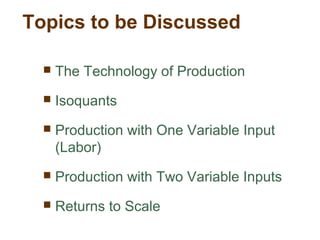 This document discusses production and the factors that influence a firm's production decisions. It covers the technology of production, production functions, isoquants, production with one and two variable inputs, and returns to scale. Key points include: isoquants show combinations of inputs that produce the same output level; production exhibits diminishing marginal returns; marginal product initially increases with additional input but eventually decreases; labor productivity and technological improvements have allowed food supply to outpace population growth, contradicting Malthus' predictions.