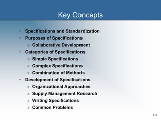Chapter 6 discusses the roles of specifications and standardization in purchasing, emphasizing their importance in effective supply chain management. It outlines the development and categories of specifications, including simple and complex types, and the collaborative approaches needed to create balanced specifications that meet various goals. Additionally, the chapter covers the history, types, and benefits of standardization, highlighting its impact on quality, cost reduction, and inventory management.