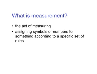 This document discusses standardized measurement and assessment. It defines key terms like measurement, scales of measurement, testing, assessment, reliability, and validity. It explains the four scales of measurement - nominal, ordinal, interval, and ratio. It also describes different types of reliability like test-retest, equivalent forms, internal consistency, and interscorer reliability. Validity is defined as the accuracy of interpretations from test scores, and validation is the process of gathering evidence to support those interpretations.
