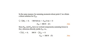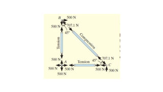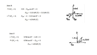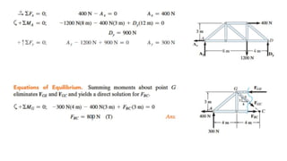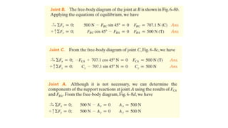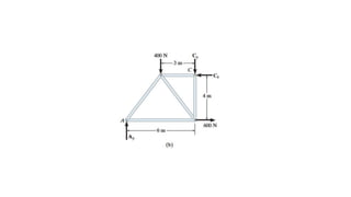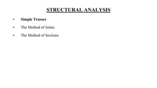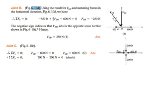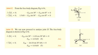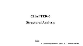 Chapter 6 of the structural analysis book discusses simple trusses, focusing on their design, methods of joints, and methods of sections for analyzing forces in members. It outlines key assumptions for truss design, such as load applications at joints and member connections by smooth pins, which are essential for accurately determining tensile and compressive forces. The chapter also emphasizes the need for equilibrium in analyzing trusses and provides procedural steps for solving member forces using free-body diagrams.