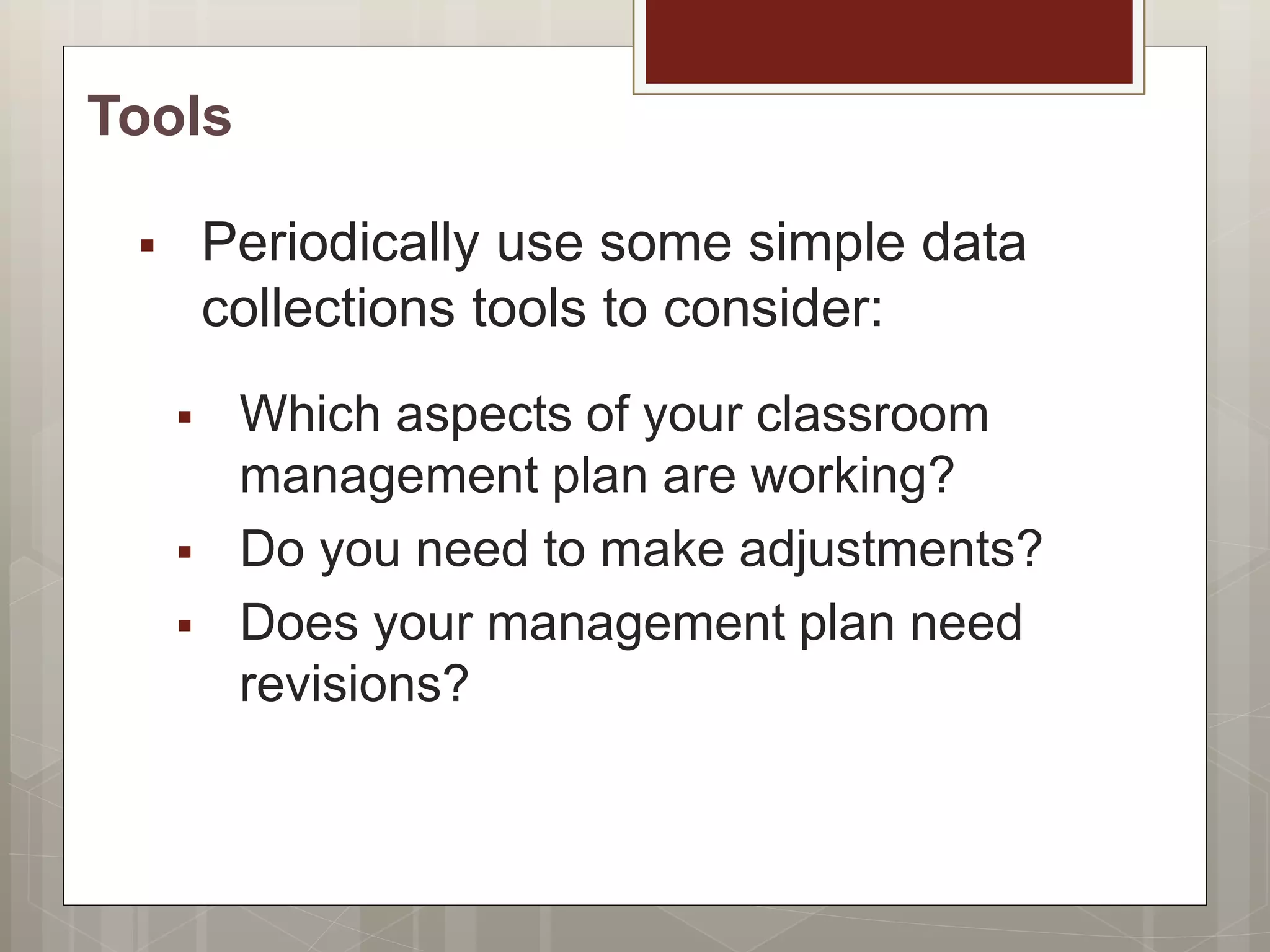 This document discusses using data collection tools to monitor and adjust a classroom management plan. It recommends using simple observation tools once or twice a month to determine which aspects of the management plan are working, if adjustments are needed, and if revisions to the plan are required. Several example tools are provided to collect data on student behavior, teacher interactions with students, the need for intervention plans, student performance, independent work time, engagement during instruction, and student and family perceptions of the classroom.