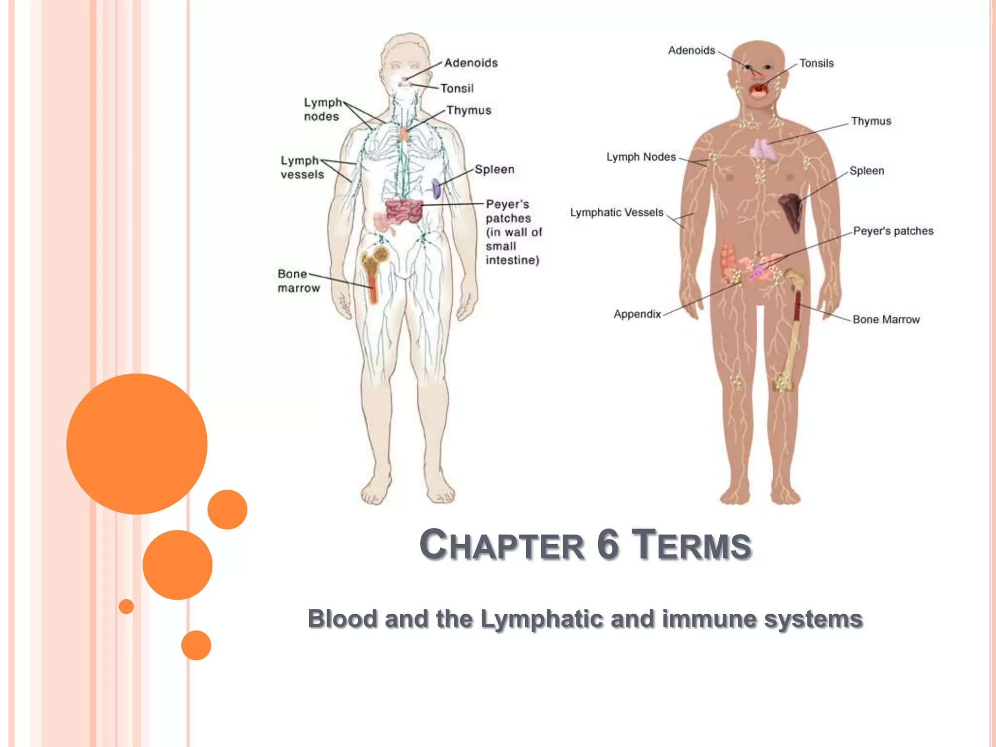 The document defines key terms related to the blood, lymphatic, and immune systems including antibodies, allergies, and vaccination. Antibodies are Y-shaped proteins produced by the immune system to detect and combat antigens like bacteria, fungi, and viruses. Allergies occur when the immune system has an unusual reaction to an allergen through itchy eyes, sneezing, or skin reactions. Vaccines work by exposing the body to weakened forms of viruses and bacteria to produce antibodies to prevent future infections from the live versions of these pathogens.