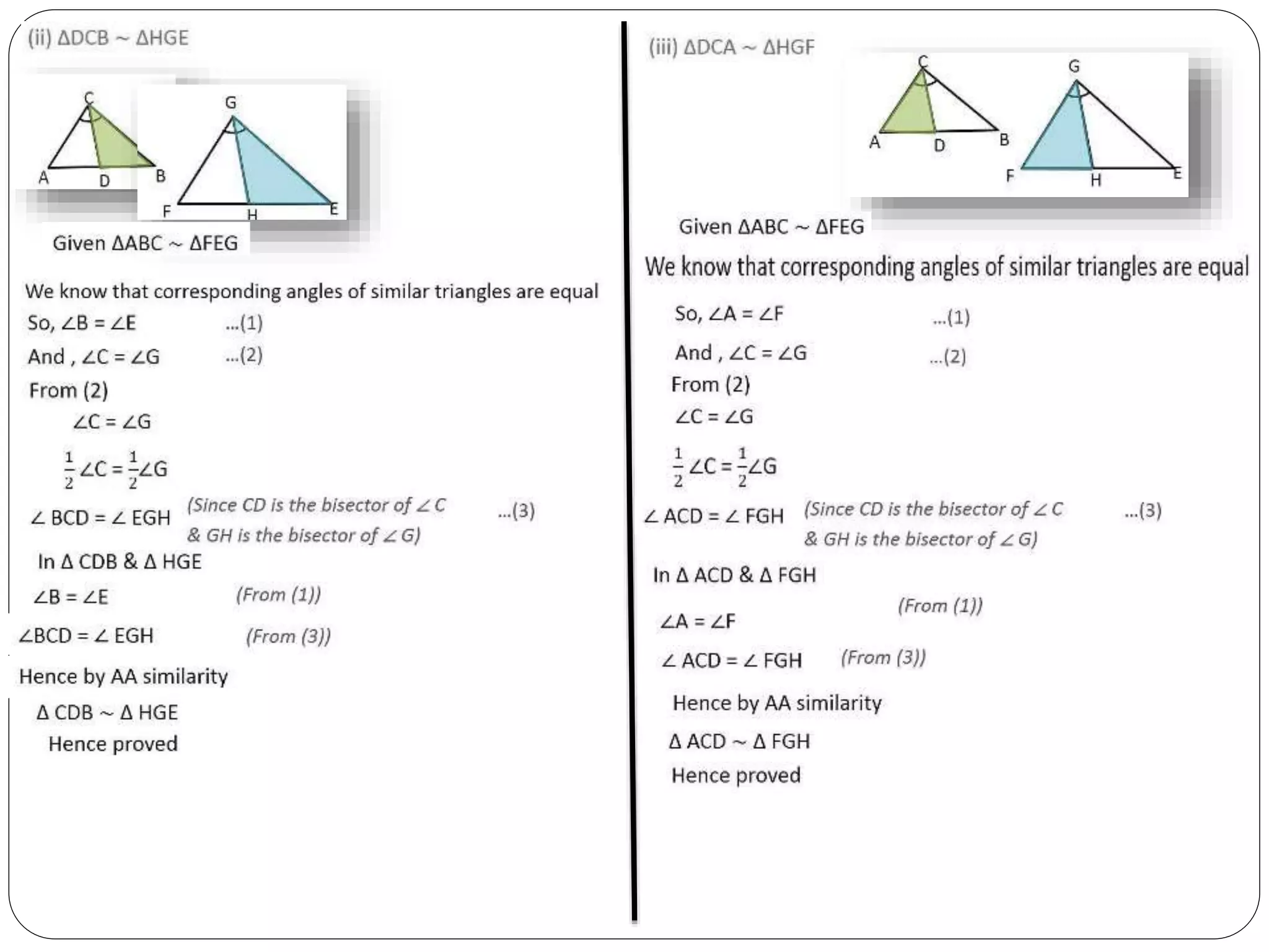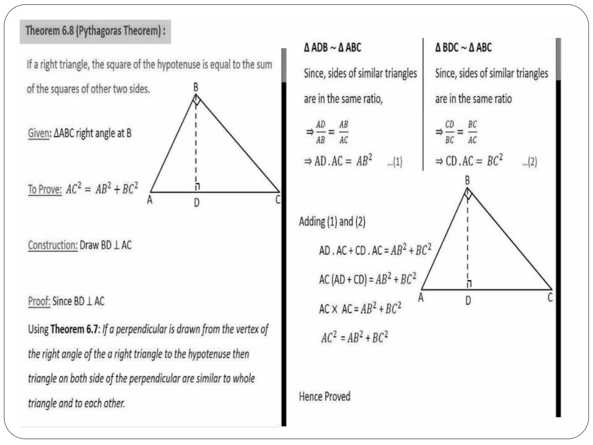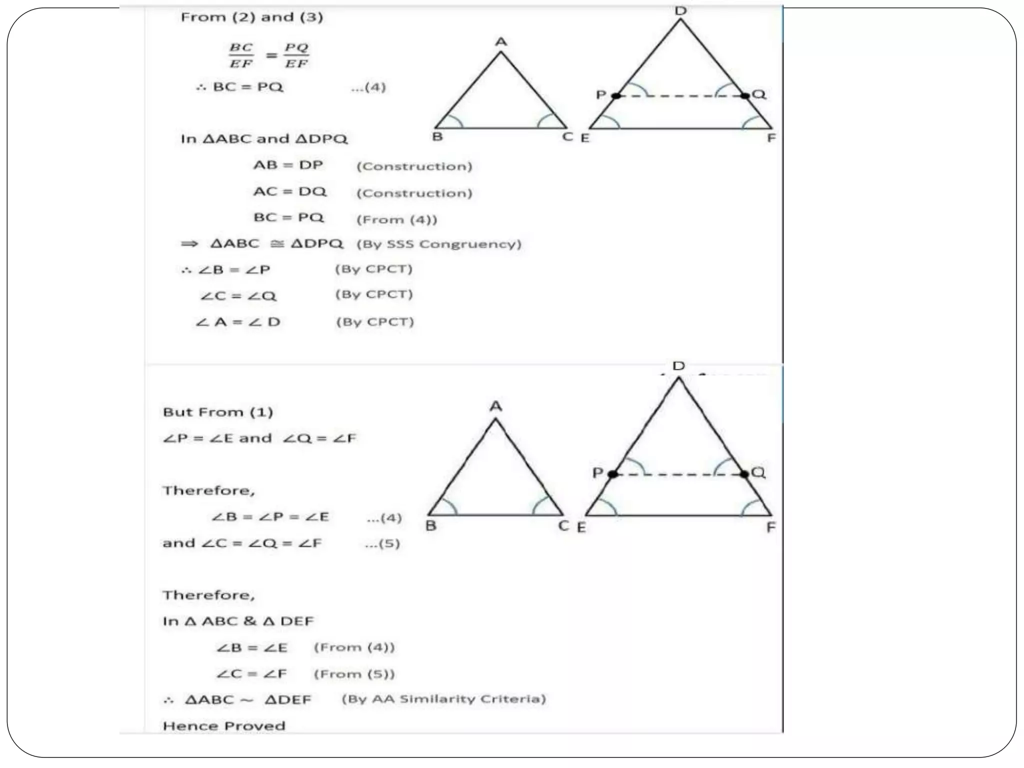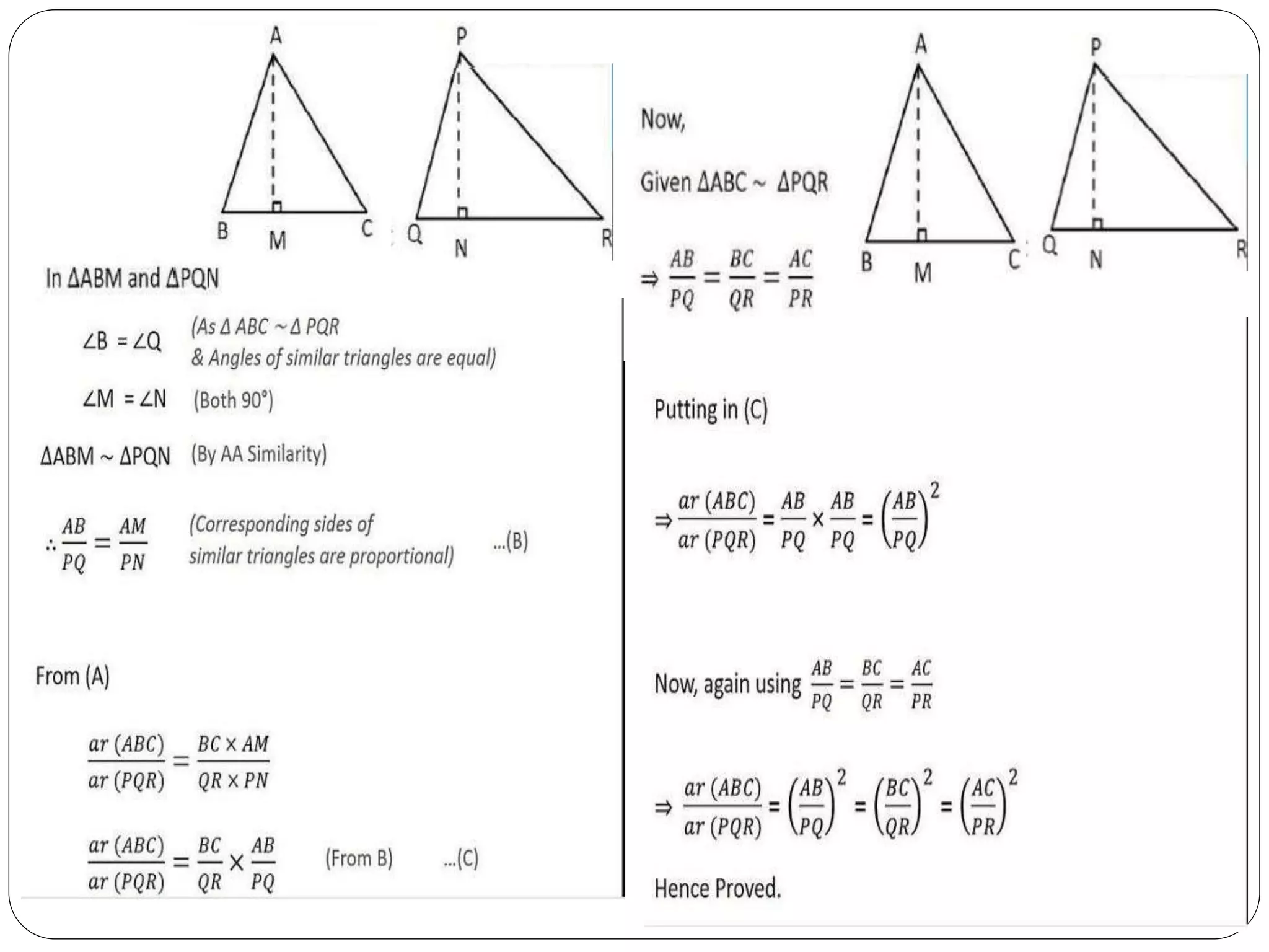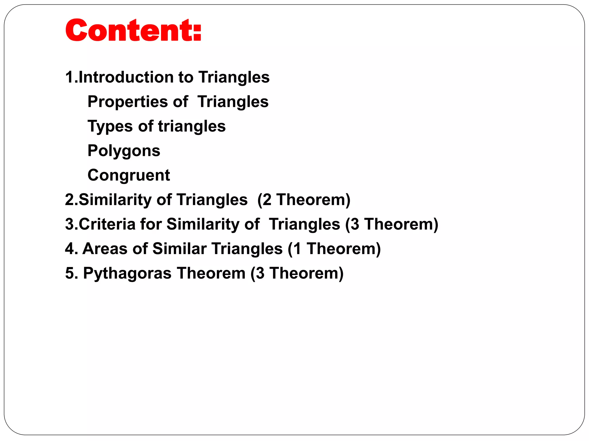 This document provides an overview of triangles, including their properties, types, similarity, areas of similar triangles, and the Pythagorean theorem. It defines triangles as polygons with three sides and angles, and notes their interior angles sum to 180 degrees. Triangles are classified by angle and side length into right, acute, obtuse, isosceles, equilateral, and scalene varieties. Similarity is discussed, along with criteria like equal angles and proportional sides. Areas of similar triangles are shown to be proportional to a ratio of corresponding sides. Finally, the Pythagorean theorem and its applications to find missing sides of right triangles are covered.