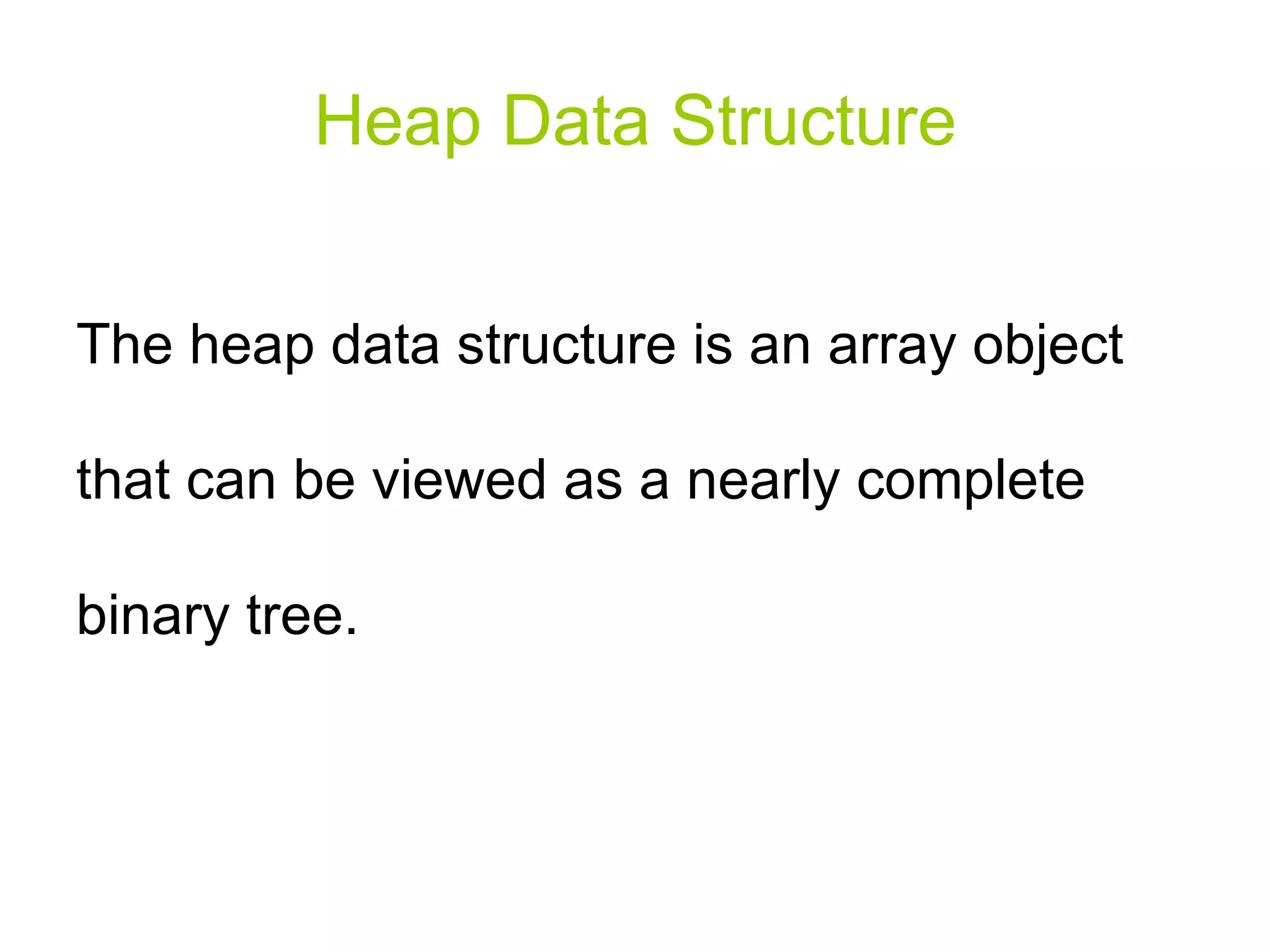 The heap data structure is a nearly complete binary tree implemented as an array. There are two types of heaps: max-heaps and min-heaps. The MAX-HEAPIFY algorithm maintains the heap property by allowing a value to "float down" the tree. BUILD-MAX-HEAP builds a max-heap by calling MAX-HEAPIFY on each node, and HEAPSORT sorts an array using the heap structure.