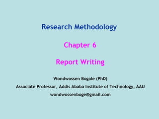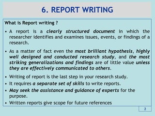 This document provides an overview of research report writing. It defines what a research report is and discusses the importance of sharing research findings through written reports. It outlines common sections of a research report such as the introduction, methods, results, and discussion. The document also discusses best practices for writing elements like the title, abstract, introduction, and conclusion. Specific report formats like IMRAD are explained. Key points covered include writing the report as findings are developed, understanding the intended audience, and being prepared to rewrite the report multiple times before completion.