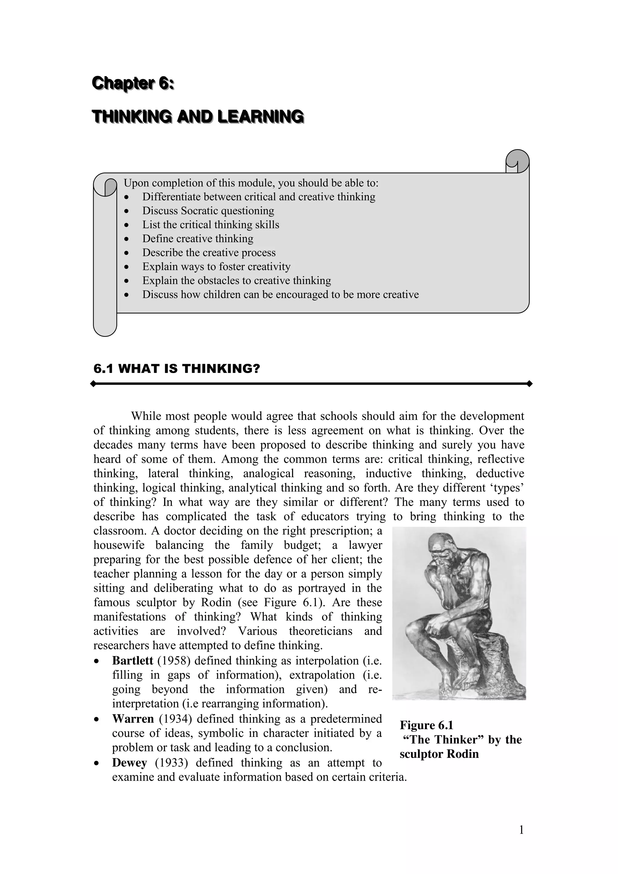 The document discusses the concept of thinking as a multifaceted process essential for problem-solving and decision-making, highlighting various definitions and characteristics of good and poor thinkers. It emphasizes the importance of teaching thinking skills in education, addressing common misconceptions held by educators regarding the ability to think among students. Furthermore, it explores critical thinking, its components, and the need to cultivate these skills to enhance learners' academic performance.