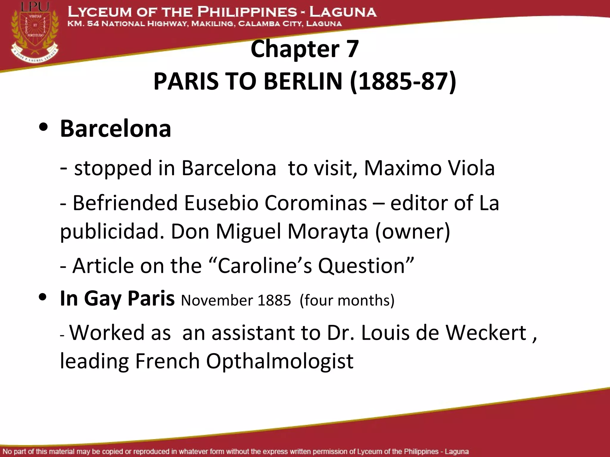 Rizal spent time in several European cities from 1885-1887, including Barcelona, Paris, Strasbourg, Heidelberg, Liepzig, Dresden, and Berlin. In Berlin, he was welcomed into scientific circles and became the first Asian to join the city's anthropological, ethnological, and geographical societies. He worked as an assistant to prominent German doctors while furthering his own studies. Rizal led a frugal life in Berlin and experienced his darkest winter financially, but continued his research, writing, and socialization within German academic communities.