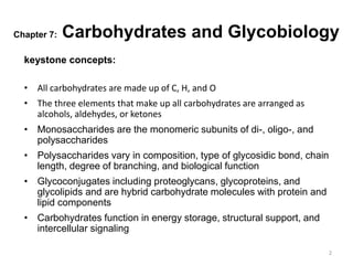 Carbohydrates are made up of carbon, hydrogen, and oxygen. They exist as monosaccharides, disaccharides, oligosaccharides, and polysaccharides. Monosaccharides can be aldoses or ketoses and exist as cyclic structures in solution. Disaccharides like sucrose are formed through glycosidic bond formation between two monosaccharides. Polysaccharides vary in composition and function, with starch and glycogen serving as energy storage and cellulose providing structural support. Glycoconjugates are carbohydrates bound to proteins or lipids that play important roles in cell signaling and recognition.
