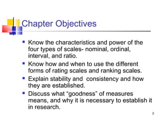 This document discusses measurement scales and establishing the reliability and validity of measurement instruments. It describes the four main types of scales - nominal, ordinal, interval, and ratio - and provides examples of each. Rating and ranking scales are also discussed, along with specific scales like Likert scales. The document stresses the importance of establishing the reliability and validity of measures to ensure the instruments accurately measure the intended constructs. Item analysis is presented as the first step, followed by assessing reliability and validity.