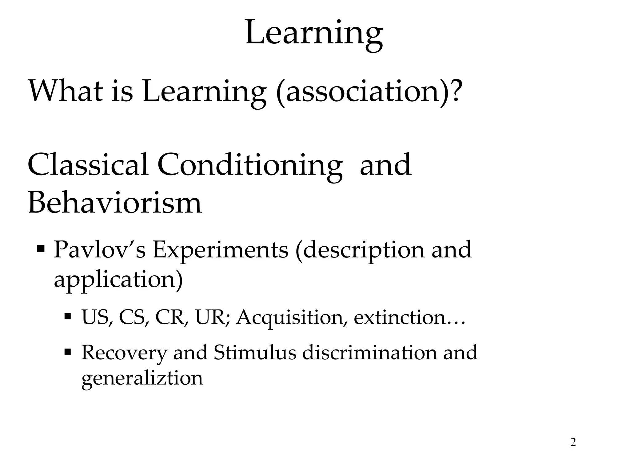 1. The document summarizes key concepts in learning from classical and operant conditioning. It describes Pavlov's experiments with classical conditioning and key terms like the unconditioned stimulus, conditioned stimulus, and conditioned response.