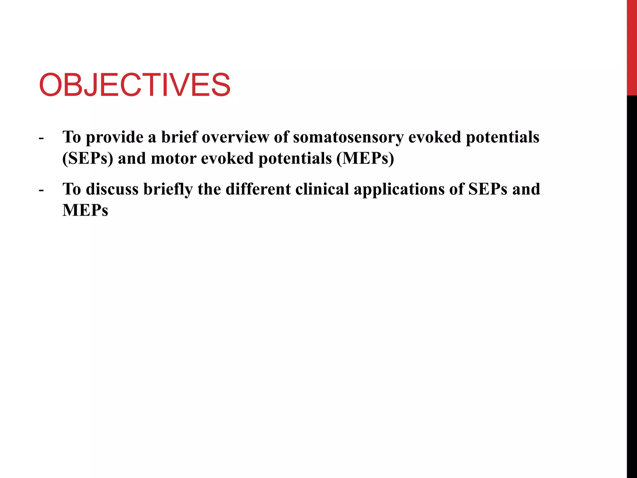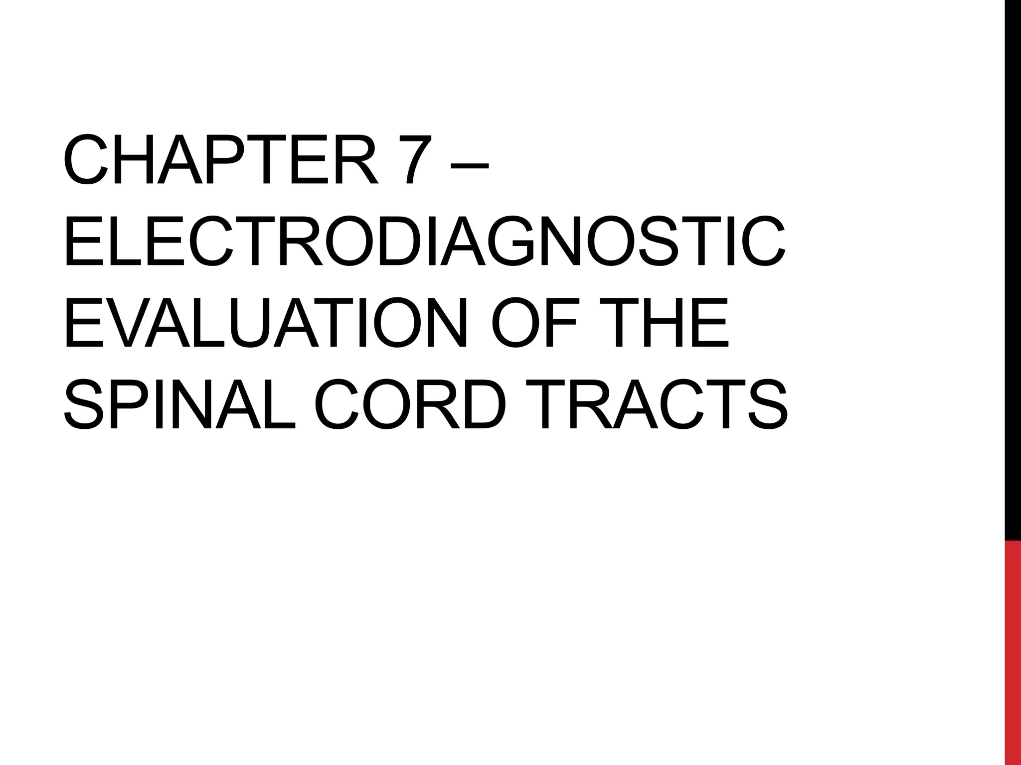 This chapter discusses somatosensory evoked potentials (SEPs) and motor evoked potentials (MEPs) which are used to evaluate spinal cord tracts. SEPs are elicited by electrical stimulation of nerves and recorded from the spine and scalp. They provide information about lesions proximal to the dorsal root ganglion and are useful for diagnosing spinal disorders. MEPs involve transcranial stimulation of motor areas and recording from muscles. They are helpful for evaluating conditions like multiple sclerosis, ALS, spinal cord injury, and stroke. Both SEPs and MEPs have clinical applications in determining prognosis and evaluating treatment for various spinal conditions.