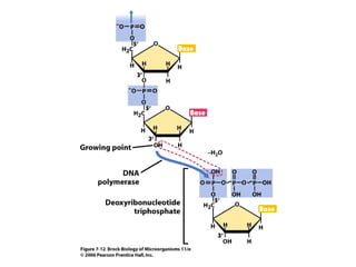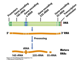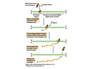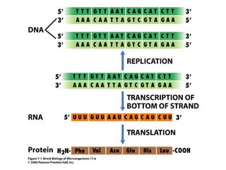 The document discusses key processes involved in gene expression and protein synthesis, including DNA replication, transcription, and translation. It provides details on: