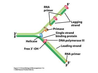 1) DNA replication through semiconservative replication where each new DNA double helix contains one original and one new strand synthesized in the 5' to 3' direction.