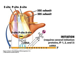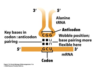 3) Translation of mRNA into polypeptide chains using the genetic code where codons in mRNA are recognized by anticodons in tRNA to add amino acids in the correct sequence. Translation terminates when a stop codon is reached.
