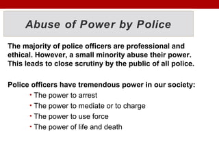 Police have tremendous power in society that can enable corruption if abused. While most officers act ethically, a small minority engage in misconduct like accepting bribes, using excessive force, or dealing drugs. Notable cases of police corruption include Frank Serpico exposing widespread corruption in the NYPD in the 1970s and over 100 officers in Puerto Rico being arrested for drug trafficking in 2010. Reducing corruption requires reforms like improving training, oversight, and establishing civilian review boards.