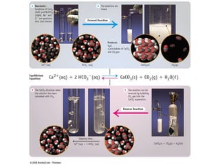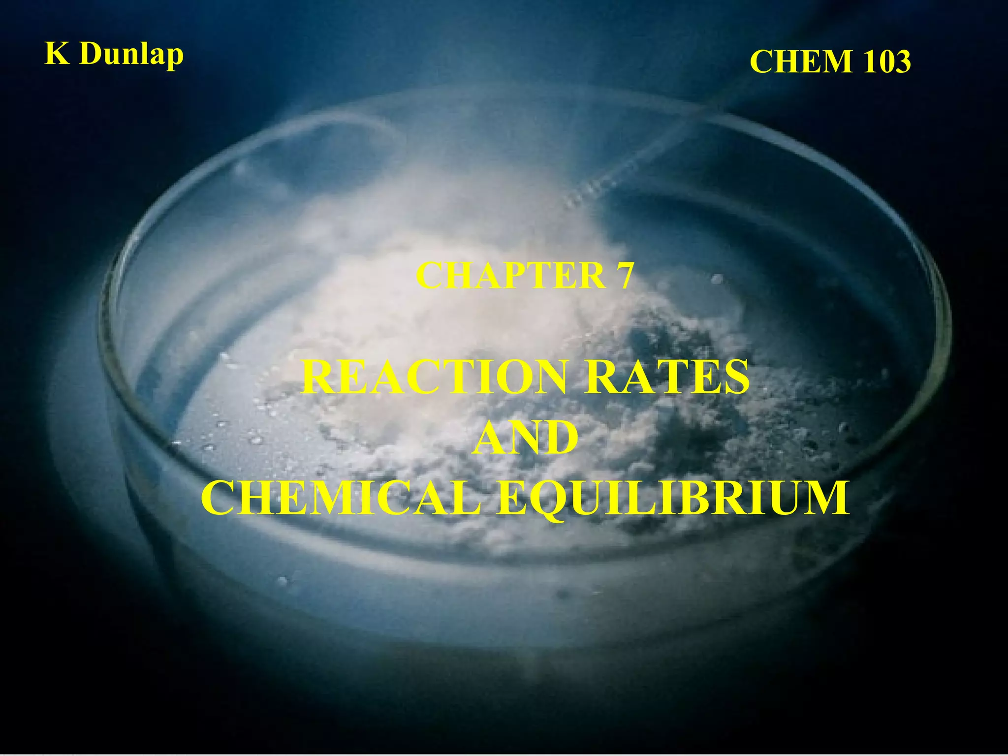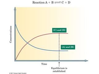 The document summarizes key concepts relating to chemical kinetics and chemical equilibrium. It discusses how the rates of chemical reactions are determined by measuring changes in concentration over time. It also explains how reaction rates are affected by molecular collisions, activation energy, nature of reactants, concentration, temperature, and presence of catalysts. The document introduces chemical equilibrium as a dynamic steady state and defines equilibrium constants. It describes Le Chatelier's principle, explaining how changing concentrations, temperature, or pressure shifts equilibrium.