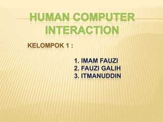 Bab 7 membahas metode evaluasi sistem interaksi manusia-komputer yang meliputi prosedur desain dan evaluasi, metode eksperimental, desain eksperimen, analisis statistik data, dan kesimpulan. Evaluasi dapat dilakukan pada berbagai tahapan desain untuk menilai aspek usability, learnability, efisiensi, dan acceptability. Eksperimen dirancang untuk menguji hipotesis dengan mengontrol variabel independen dan mengukur variabel dependen. Tujuan evalu