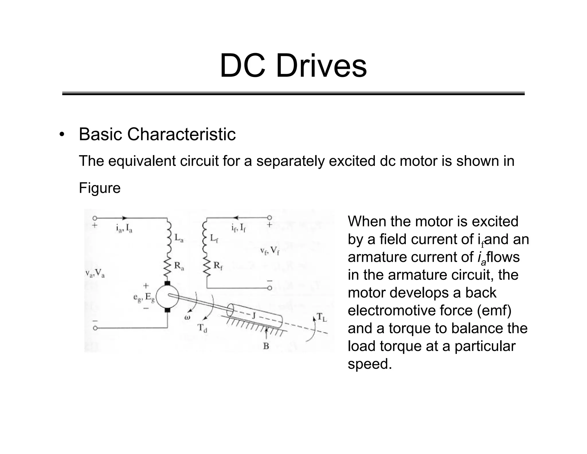 This document discusses power electronics applications in DC and AC drives. It describes the basic characteristics and equivalent circuits of DC motors and how their speed can be controlled through various single-phase and three-phase converter configurations. It also summarizes the operation of induction motors, including cage and slip-ring types, and how their speed can be controlled through variable frequency inverters or by adjusting the slip-ring voltage. The document concludes by outlining the main components of HVDC converter stations used for long distance and asynchronous power transmission.