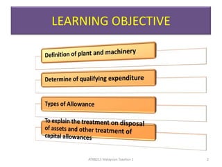 This document provides an overview of capital allowances under Malaysian tax law. It discusses that while accounting depreciation is not tax deductible, taxpayers are granted tax depreciation or "capital allowances" on qualifying capital expenditures to determine taxable income. Capital allowances are only given for business sources and only to the person who incurs the qualifying expenditure. The document outlines the types of capital allowances (initial allowance, annual allowance, notional allowance), eligibility requirements, qualifying expenditures, treatment of plant and machinery purchases and disposals, and other related topics.