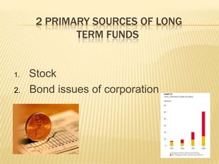 This document discusses different types of corporate stocks used by companies to raise long-term funds. It describes common stocks and preferred stocks, and the key differences between them. Preferred stocks have priority over common stocks in terms of dividends and assets. The document also discusses various features of stocks, including convertible, callable, sinking fund provisions, and classes of common stocks that restrict voting or have preferential dividend rights.
