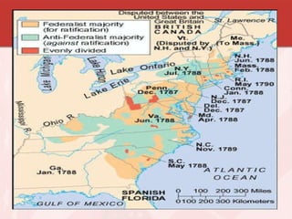 The document summarizes key events in the creation of the US Constitution. It describes the weaknesses of the Articles of Confederation and the various compromises reached at the Constitutional Convention to address state interests. Key issues included representation in Congress, the slave trade, and balancing state and federal power. The Constitution drew on ideas from ancient Rome, Enlightenment thinkers, and the English system. Its ratification was debated, with Federalists supporting it and Antifederalists wanting stronger protections for individual rights, leading to the addition of the Bill of Rights.