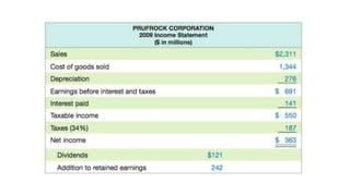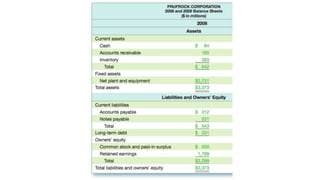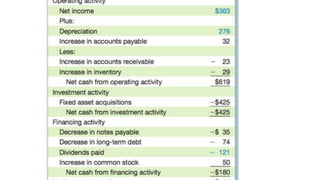 - The cash flow statement provides data on cash inflows and outflows from operations, investing, and financing activities during a period.