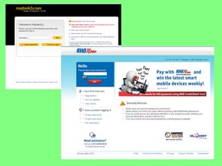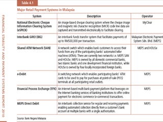 Electronic banking systems allow customers to access banking services electronically rather than through traditional paper-based methods. The document defines electronic banking and electronic funds transfer, and identifies the key types of electronic banking systems including non-customer activated systems like SWIFT used between financial institutions, and customer activated systems like ATMs, EFTPOS, credit/debit cards, home banking, mobile banking, and internet banking. It discusses functions of these systems like cash withdrawals, deposits, transfers, and bill payments. The document emphasizes issues like security, secrecy and banks' reliance on IT services for electronic banking.