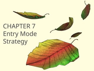Chapter 7 discusses entry mode strategies for international business, including trade-related (exporting, subcontracting, countertrade) and transfer-related strategies (franchising, licensing, leasing, and build-operate-transfer). Exporting is highlighted as a less risky option compared to foreign direct investment, while countertrade offers flexible financing. Key considerations and documentation involved in these processes, as well as their respective advantages and disadvantages, are also explored.