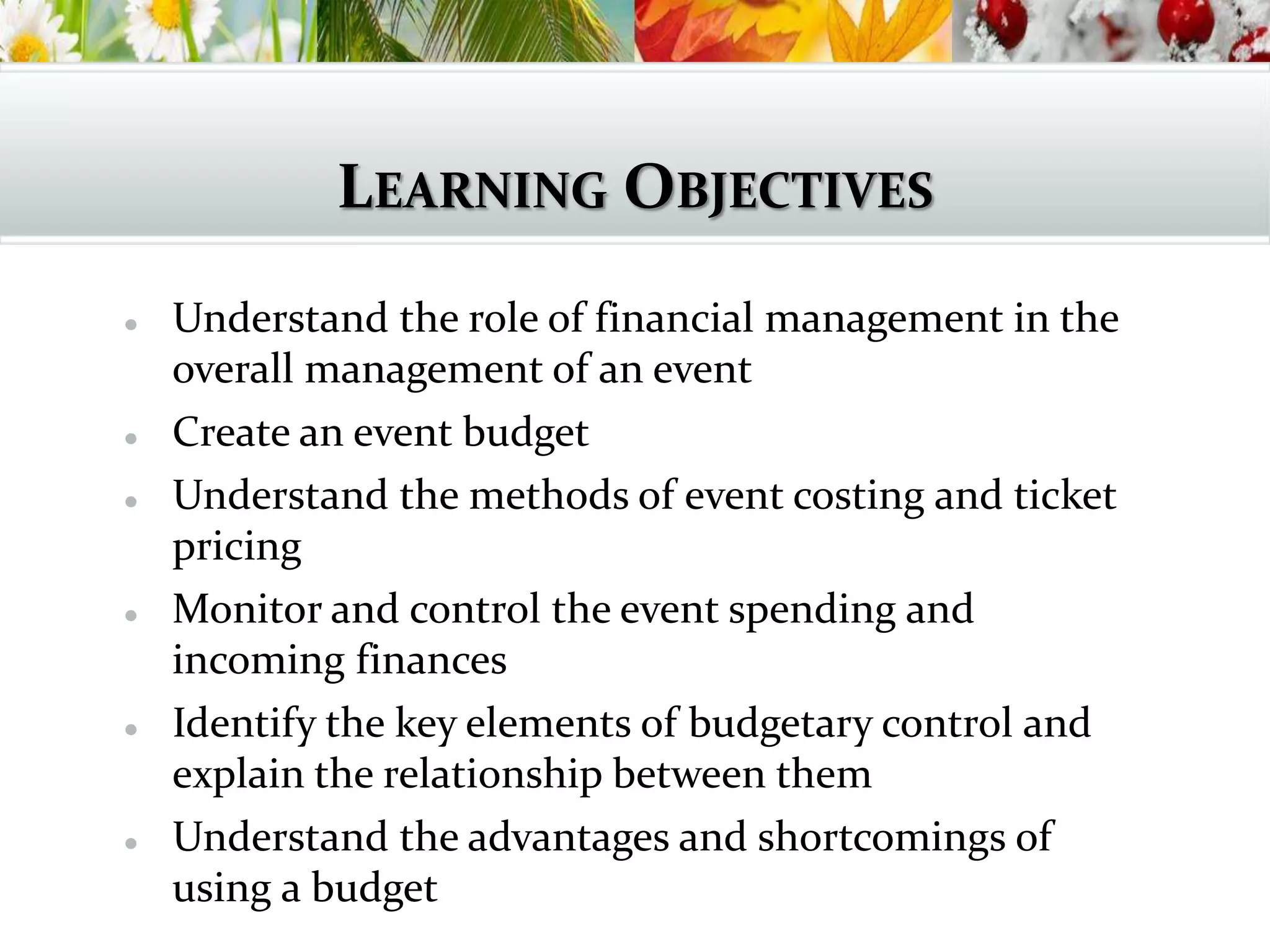 This document provides an overview of financial management for events. It discusses the importance of financial management, how to create an event budget, methods for estimating costs and ticket pricing, monitoring spending and revenues, using budgets for control, and tips for reducing costs and increasing income. The key aspects of financial management covered include creating a budget, forecasting cash flow, using ratio analysis and break-even charts for evaluation, cost estimation and control, and financial reporting.