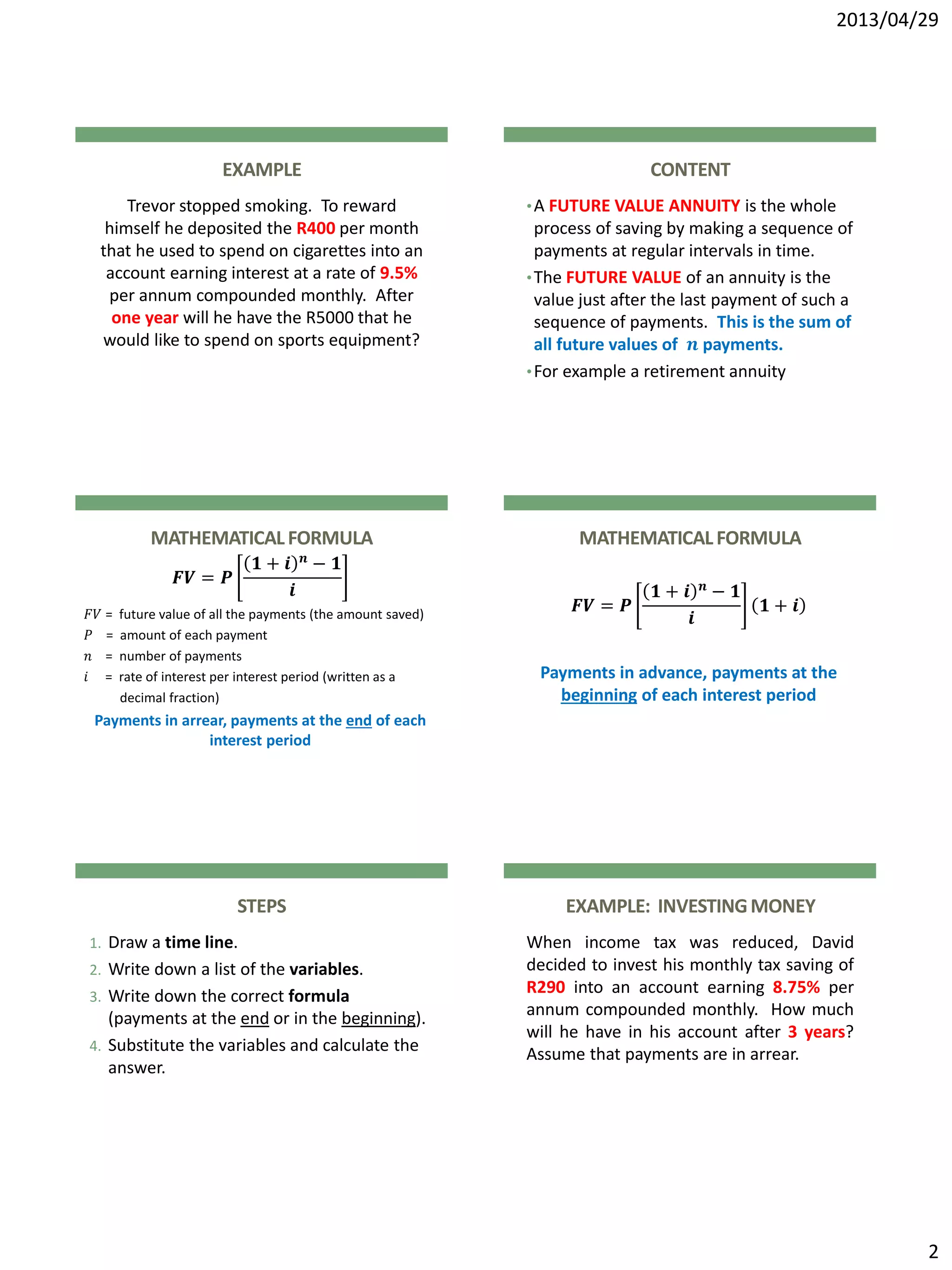 This document contains examples and information about future value annuities (installment savings). It includes the mathematical formulas for calculating future values of annuities with payments made in arrear or in advance. There are examples of using annuities to calculate savings amounts for equipment replacement, home repairs, and retirement savings. The document also covers other topics like sinking funds, loans, hire purchase and timelines.