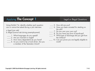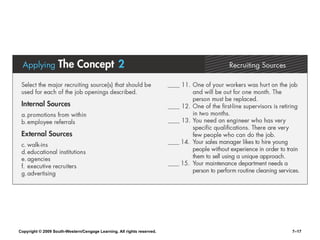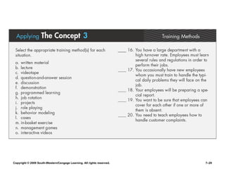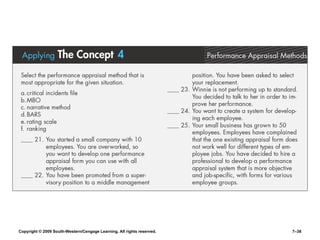 The document discusses key aspects of human resource management, including the four parts of the HR process, job analysis, recruiting, selection, orientation, training, performance appraisal, compensation, and benefits. It provides exhibits that define terms like job descriptions and specifications. The exhibits describe sources for recruiting, types of interviews and questions, training methods, performance appraisal processes, and compensation considerations.