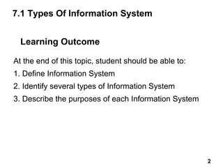 The document discusses the types of information systems and the system development life cycle (SDLC). It defines various types of information systems including transaction processing systems (TPS), management information systems (MIS), decision support systems (DSS), executive support systems (ESS), and office automation systems (OAS). It describes the characteristics and users of each system. The document also outlines the five phases of the SDLC: planning, analysis, design, implementation, and maintenance.