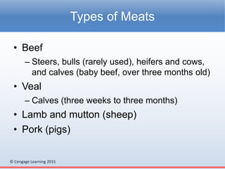 The document discusses meat, including the main types of meat from beef, veal, lamb, and pork. It covers the composition of meats such as muscle, connective tissue, fat, and bone. Important aspects of purchasing meats are addressed, including inspection, grading, tenderness factors. Preparation techniques for meats are outlined, including dry and moist heat cooking methods. Proper storage of meats in refrigeration or freezing is also covered.