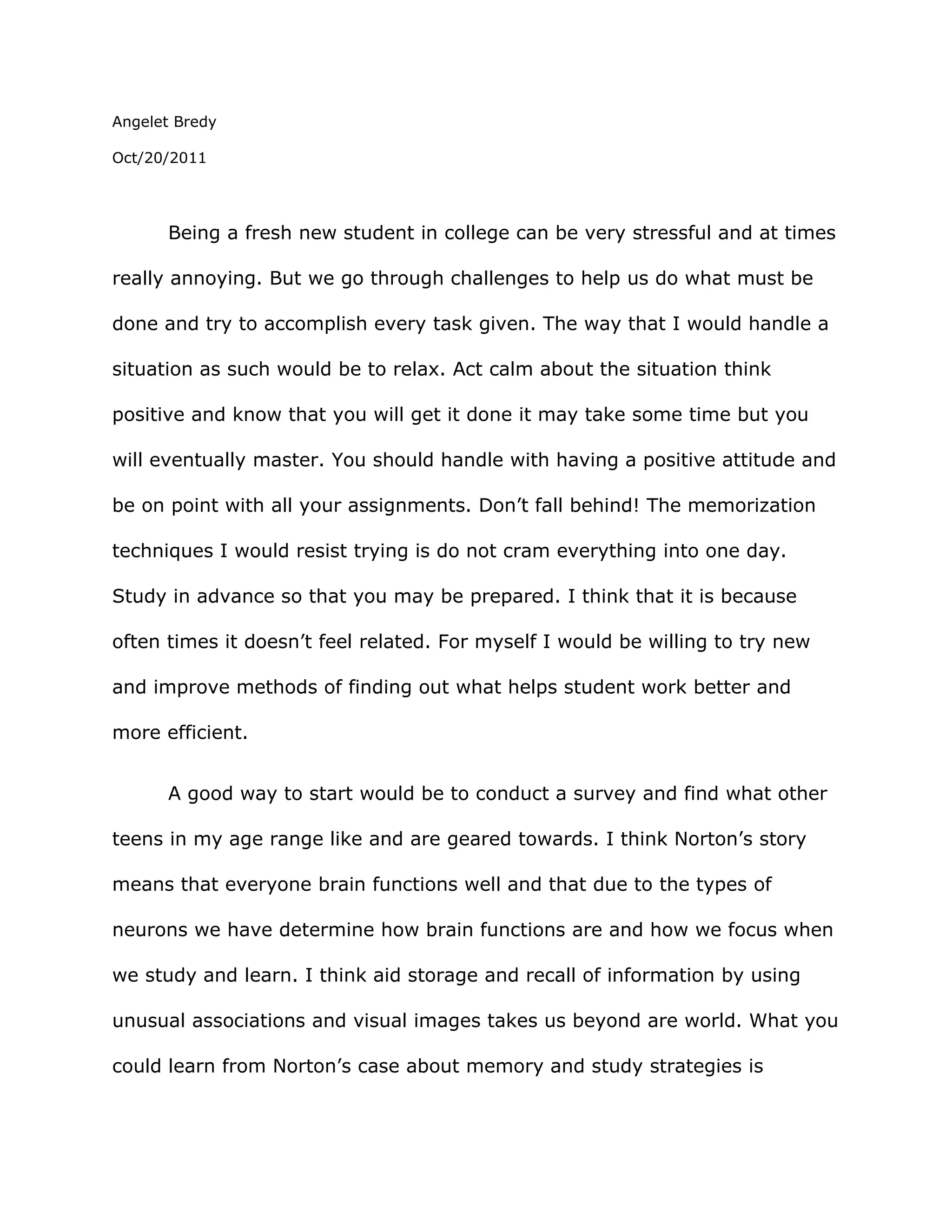 The document discusses strategies for handling the stresses of being a new college student. It recommends staying positive, managing time well by studying in advance instead of cramming, and using memorization techniques like visual images and unusual associations. The document also discusses taking advantage of campus resources and making connections with other students in classes.