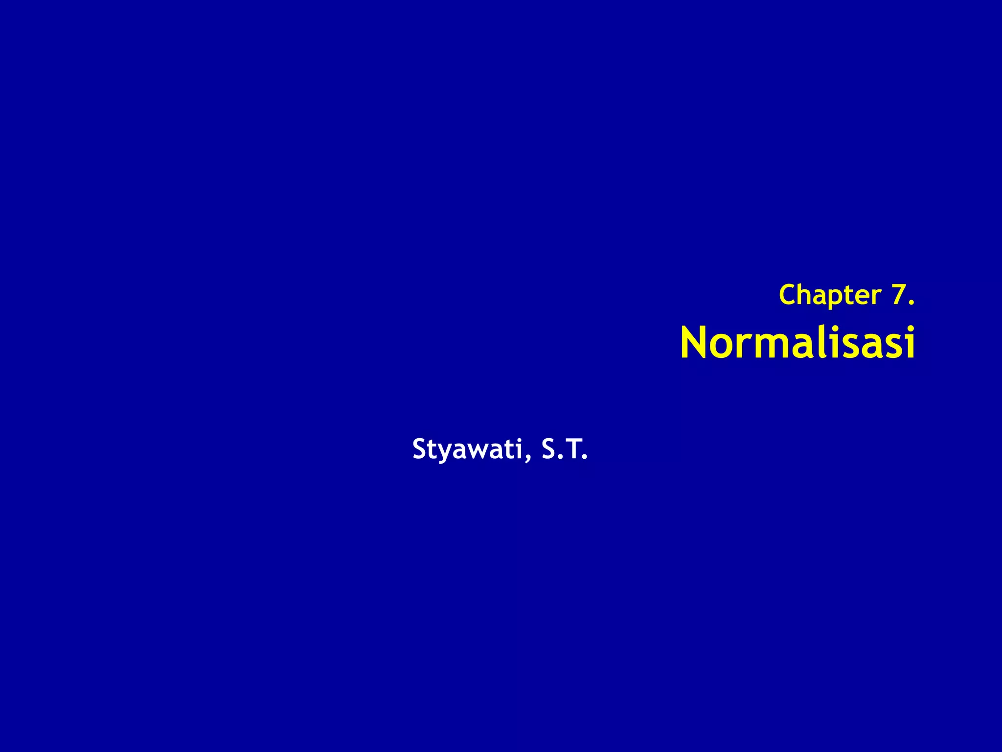 Dokumen ini membahas teknik normalisasi dalam basisdata untuk menghindari anomalai seperti insertion, deletion, dan update. Terdapat penjelasan tentang berbagai bentuk normalisasi, yaitu 1NF, 2NF, dan 3NF, serta contoh tabel yang tidak normal dan sudah dinormalisasi. Selain itu, disertakan studi kasus diagram ERD yang melibatkan departemen, proyek, dan karyawan.