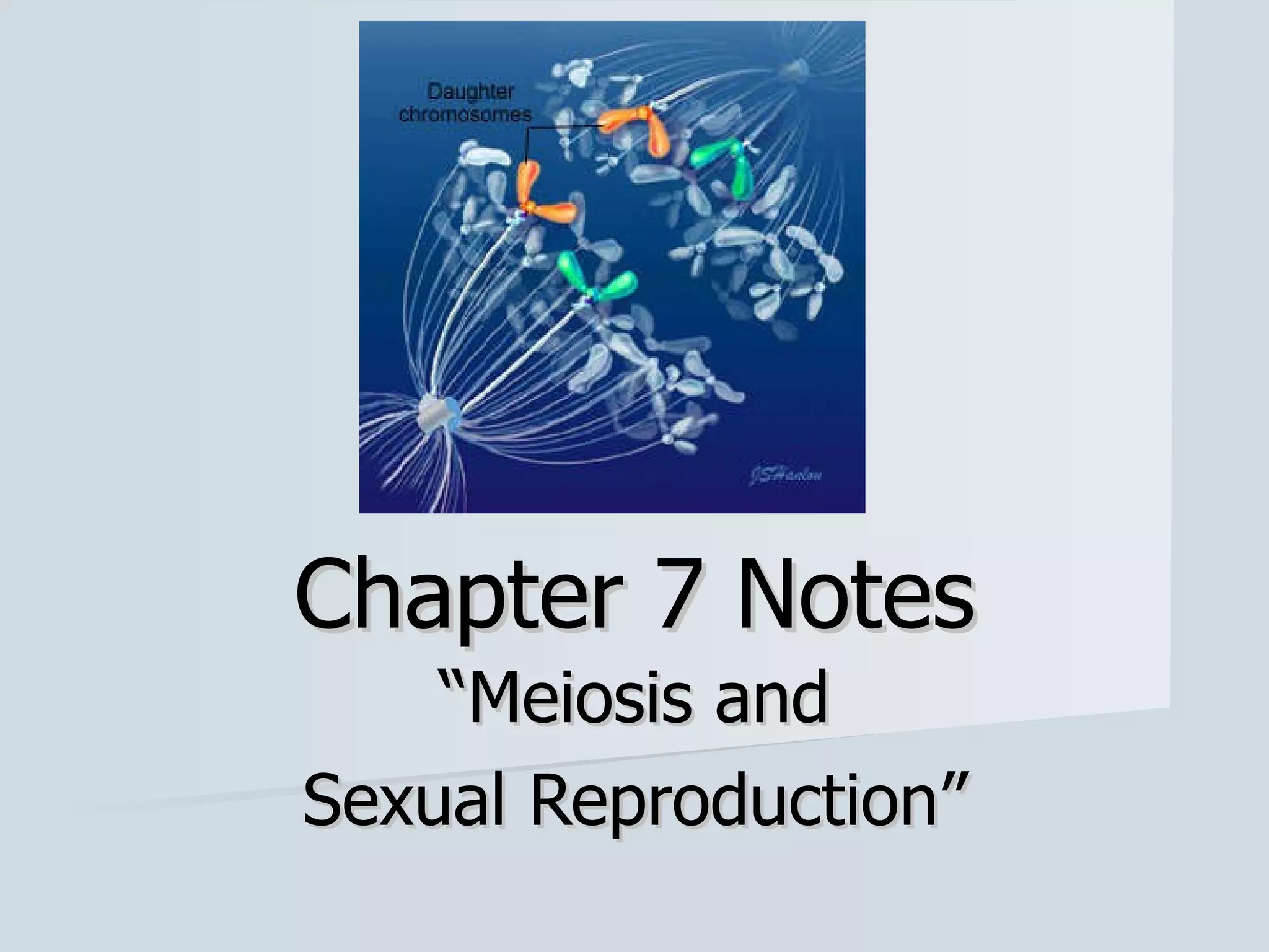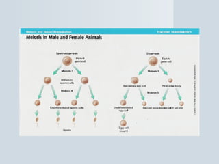Meiosis reduces the number of chromosomes in cells from diploid to haploid, forming four haploid gametes from one diploid cell. This occurs through the processes of independent assortment, crossing over, and random fertilization, which contribute to genetic variation and allow for evolution. Meiosis produces either sperm cells in males through spermatogenesis or egg cells in females through oogenesis, where the cytoplasm unequally divides. Sexual reproduction then involves the union of haploid gametes from two parents to form a diploid zygote, resulting in offspring that are genetically different from the parents.