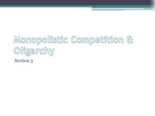 This document discusses different market structures: monopolistic competition, oligopoly, and perfect competition. It provides characteristics of each: monopolistic competition has many small firms with differentiated products, little barriers to entry, and little price control; oligopoly has a few large firms with high barriers to entry and some price control; perfect competition has many small firms with identical goods and no barriers to entry. The document also covers nonprice competition, prices, output and profits for these market structures. It discusses government regulation of markets through antitrust laws, approval of mergers, and deregulation to promote competition.