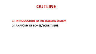 The document provides an overview of the skeletal system, including its components, functions, and the anatomy of bones. It discusses the classification of bones, types of bone tissue, and the various cell types involved in bone development and remodeling. Additionally, it details the processes of bone formation, growth, and related conditions such as achondroplastic dwarfism.