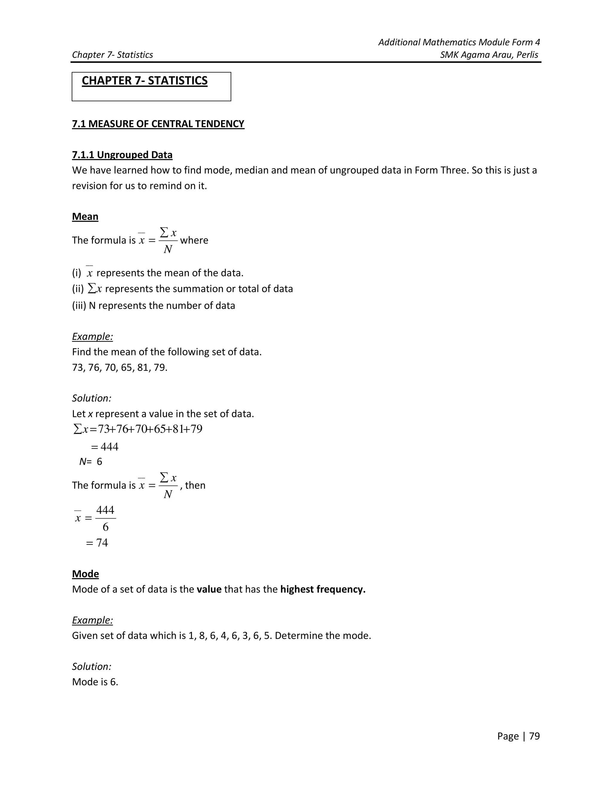 The document provides information about measures of central tendency and dispersion in statistics. It discusses finding the mode, median, and mean of ungrouped and grouped data. It also discusses determining the range and interquartile range of ungrouped and grouped data. Formulas are provided for calculating the mean, median, mode, range, interquartile range, and variance of data sets. Examples are worked through to demonstrate calculating these statistical measures from raw data sets and frequency distribution tables.
