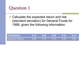 This document contains questions about calculating expected return and risk for stock portfolios. It asks to calculate the expected return and standard deviation for General Foods for 1999 based on given probability and return data. It also asks to calculate the expected return of portfolios consisting of 4 securities under different weighting conditions: with 25% weighting for each security, 10% for A and equal remaining weights, and 10% each for A and B and 40% each for C and D.