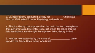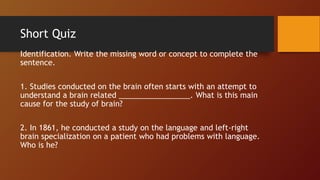 1. It summarizes Paul Broca's 1861 study on language lateralization, Roger Sperry's split-brain research which earned him a Nobel Prize, and Paul MacLean's triune brain theory identifying three brain structures.