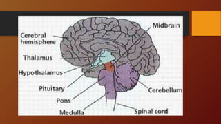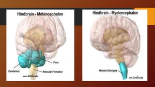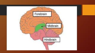 3. The document outlines functions of the hindbrain, midbrain, and forebrain. It also explains how the left and right hemispheres are specialized for different cognitive tasks according to the split-brain theory