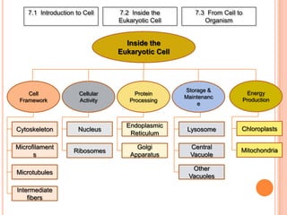 The document summarizes the major organelles and structures found within eukaryotic cells, including their functions. It describes the cytoskeleton which provides structure and organization to the cell. It also outlines the roles of the nucleus which directs cell activity, the endoplasmic reticulum and Golgi apparatus which process and package proteins, mitochondria which produce energy, lysosomes which break down molecules, vacuoles which store substances, and chloroplasts which perform photosynthesis in plant cells.